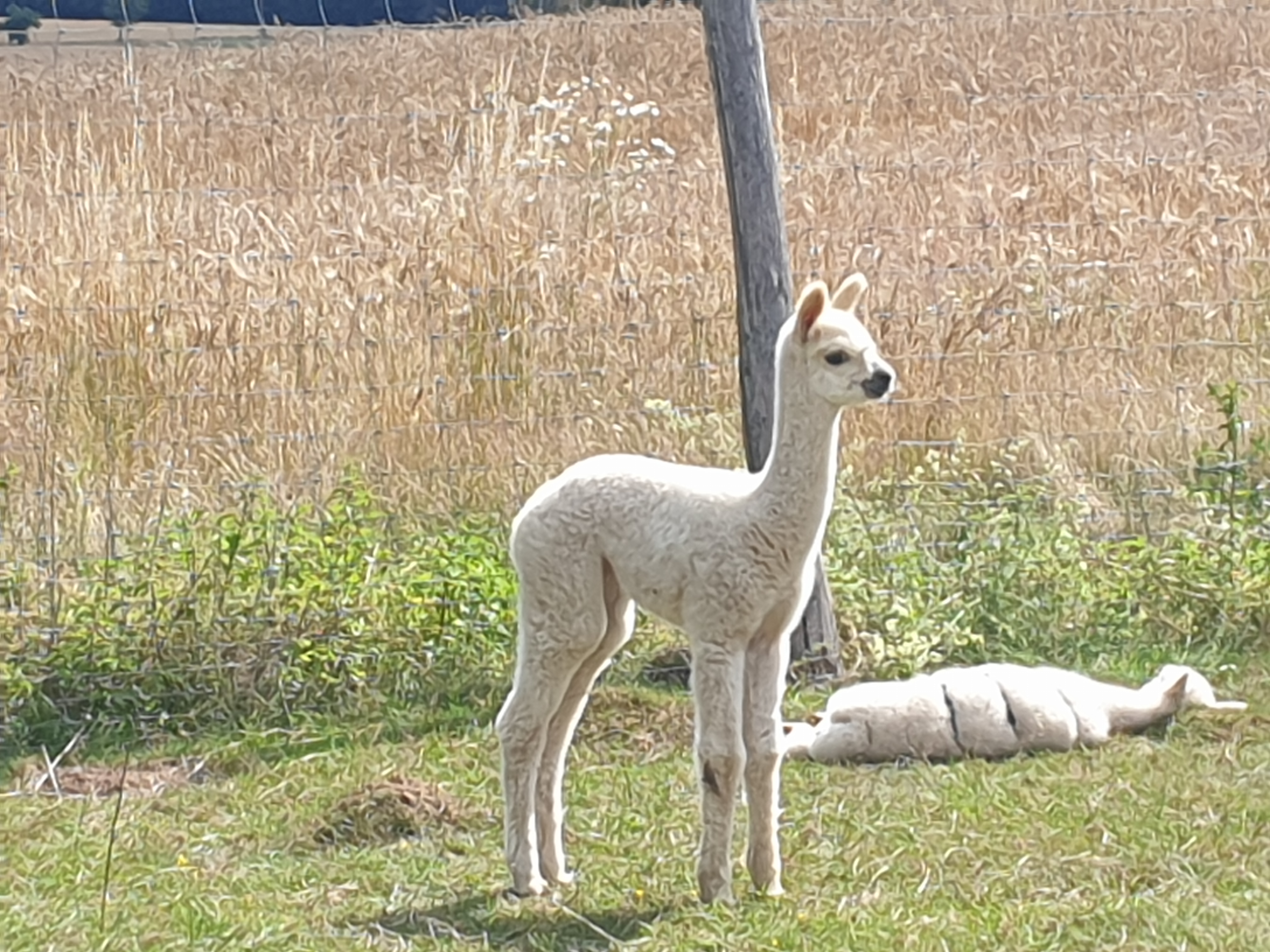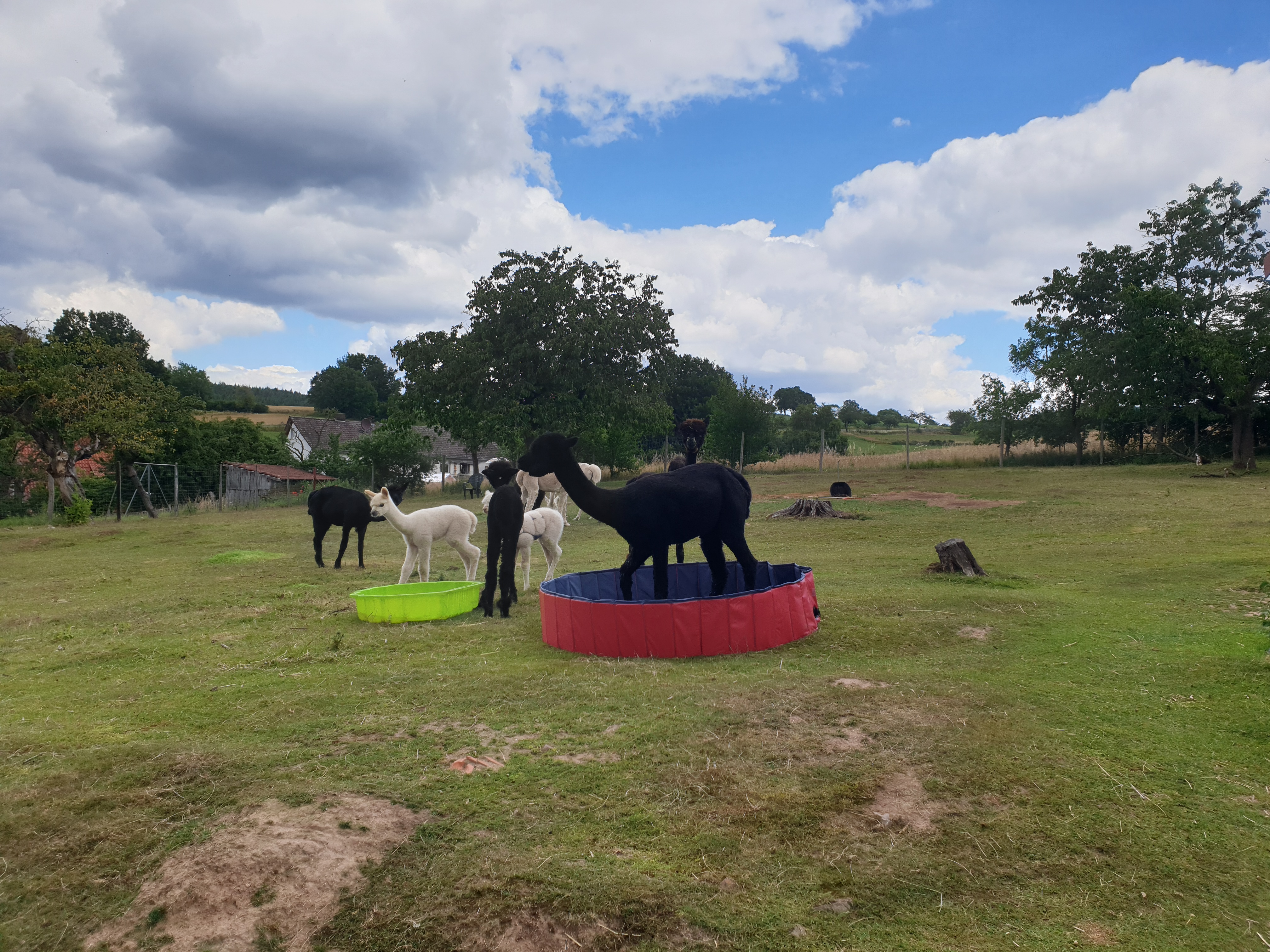 Die Kotplätze (Alpakas sind saubere Tiere und legen extra Stellen an, die sie dann nicht beweiden) sollten täglich gereinigt werden, die Tränken mit frischem Trinkwasser gefüllt und auch bei vorhandenem Gras Heu rund ums Jahr zusätzlich ergänzt werden.